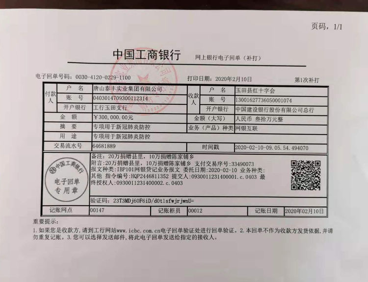 2月10日,开云手机在线登入有限公司向玉田县红十字会定向捐赠30万元,专项用于新冠肺炎防控,20万元捐赠县里,10万元捐赠陈家铺乡,全力支持县、乡抗击新冠肺炎疫情。