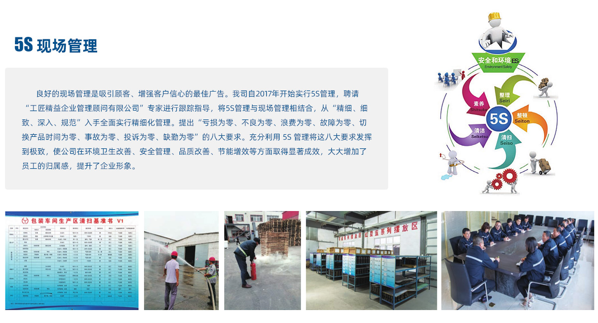 【概要描述】良好的现场管理是吸引顾客、增强客户信心的最佳广告。我司自2017年开始实行5S管理,聘请“工匠精益企业管理顾问有限公司”专家进行跟踪指导,将5S管理与现场管理相结合,从“精细、细致、深入、规范”入手全面实行精细化管理。提出“亏损为零、不良为零、浪费为零、故障为零、切换产品时间为零、事故为零、投诉为零、缺勤为零”的八大要求。充分利用5S管理将这八大要求发挥到极致,使公司在环境卫生改善、安全管理、品质